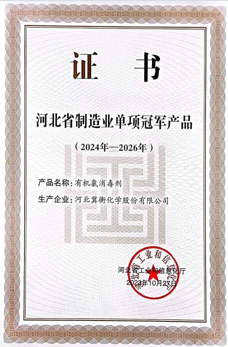 近日,河北省工業(yè)和信息化廳公布了《2024年河北省制造業(yè)單項冠軍企業(yè)名單》,河北冀衡化學(xué)股份有限公司憑借其在有機氯消毒劑行業(yè)領(lǐng)先的制造技術(shù)和全球領(lǐng)先的市場份額,榮獲“河北省制造業(yè)單項冠軍產(chǎn)品”稱號。